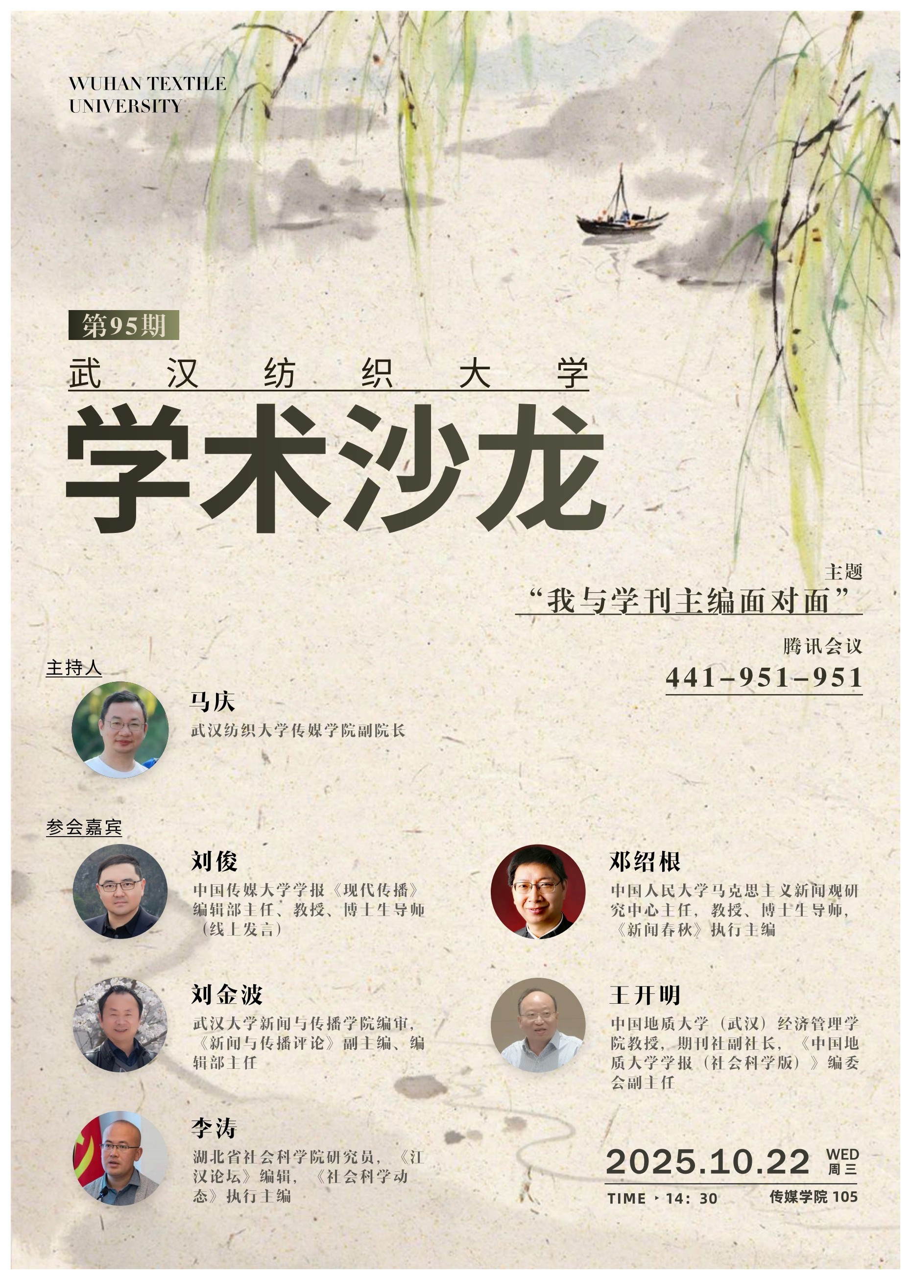 2025年10月22日,五家CSSCI学刊主编、编辑齐聚亮相雷火电竞平台第95期学术沙龙之“我与学刊主编面对面”。来自《现代传播》《新闻春秋》《新闻与传播评论》《中国地质大学学报》《江汉论坛》等五家知名学刊的编审专家围绕青年学者普遍关心的中文核心期刊“发表难”“周期长”“刊文少”等问题与纺大师生展开线上线下的深入交流。雷火竞技官网、服装学院、艺术学院、外国语学院师生,武汉大学博士研究生、校友李一涵参会,沙龙由雷火竞技官网副院长马庆主持。