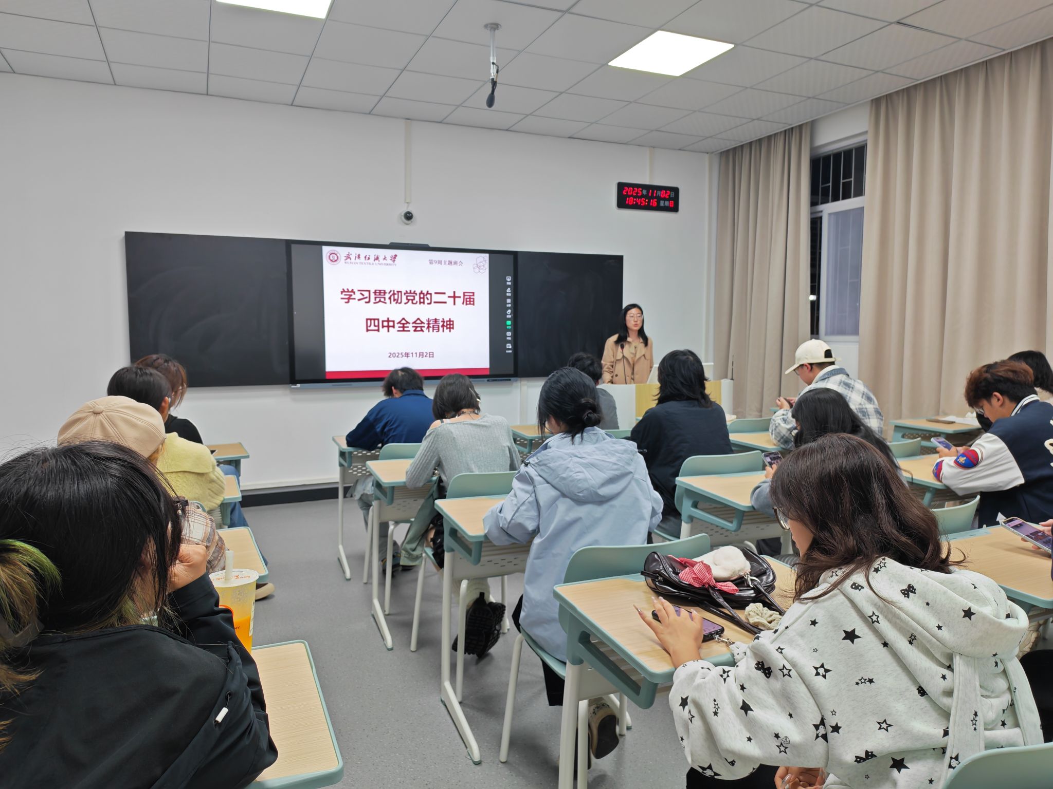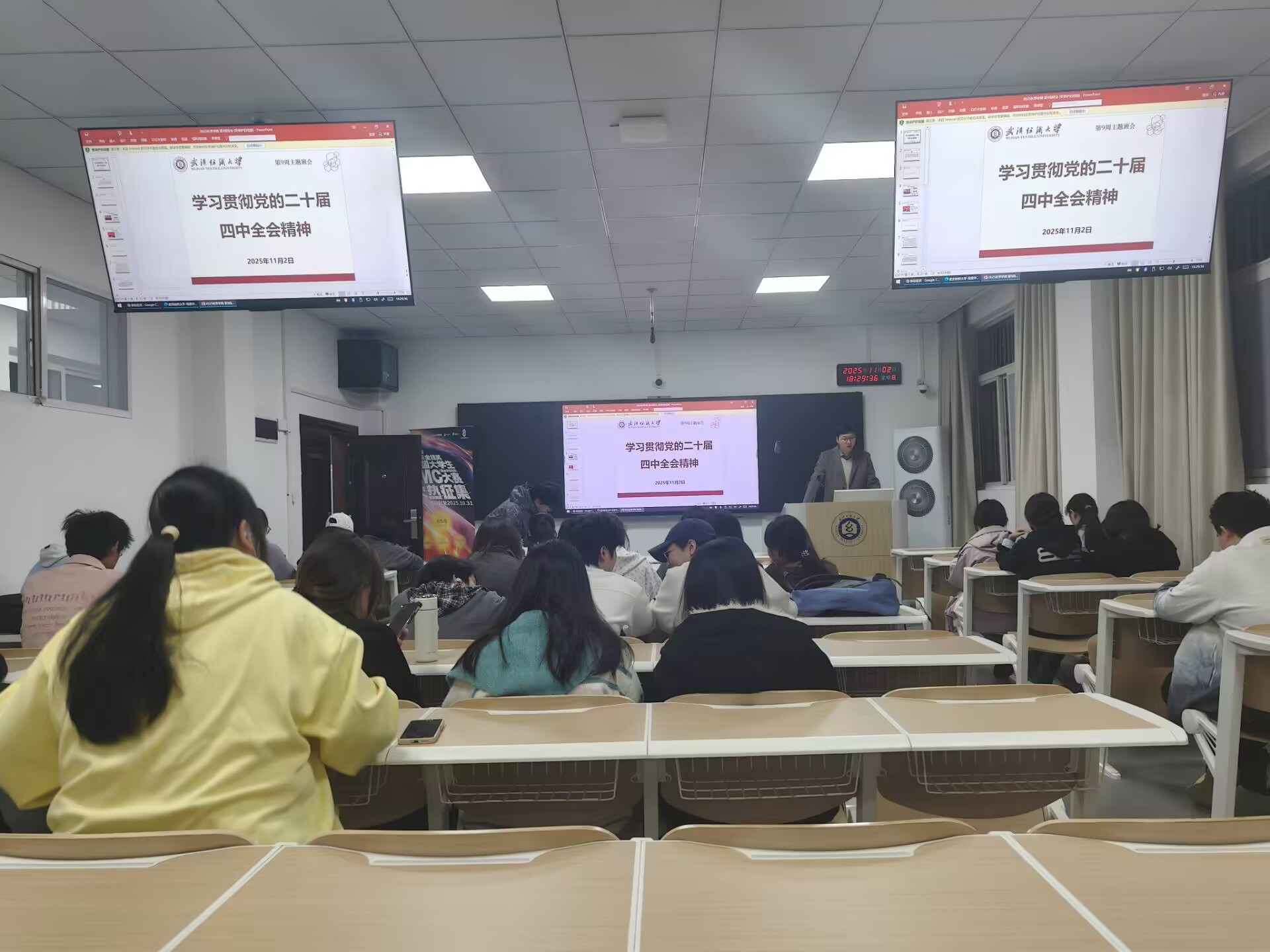 为深入学习贯彻党的二十届四中全会精神,引导广大学生以担当实干、奋楫争先的姿态投身新时代新征程,雷火竞技官网各班级于11月2日晚上召开“学习贯彻党的二十届四中全会精神”主题班会。会议由各班班主任主持,全体学生参加。