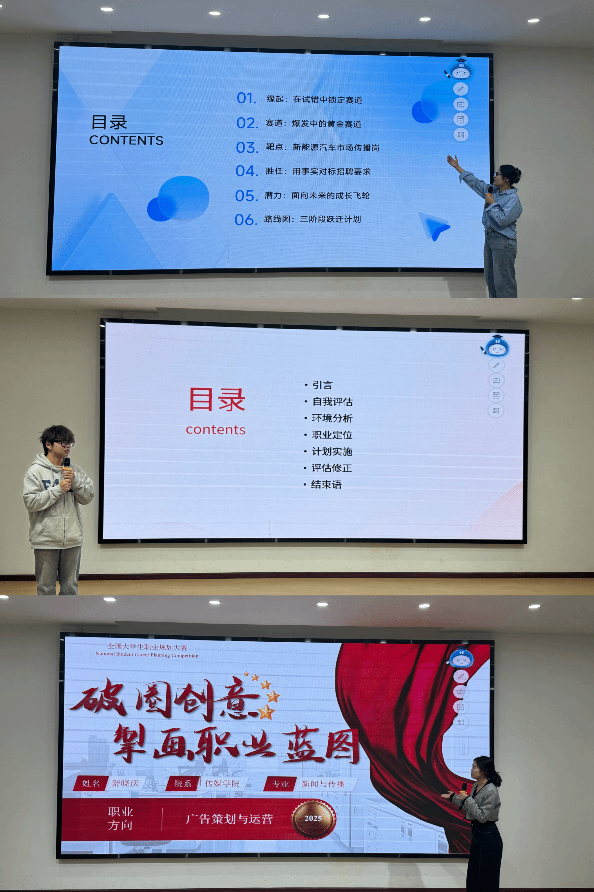 比赛自启动以来,受到了学院师生的广泛关注和积极参与。经过前期班级推荐和初赛筛选,共有来自不同年级、不同专业的六名优秀选手脱颖而出,晋级院级决赛。决赛现场,选手们结合个人兴趣、专业特长和行业前景,通过精美的PPT、清晰的陈述和从容的答辩,全方位、多角度地展示了自己的职业生涯规划。