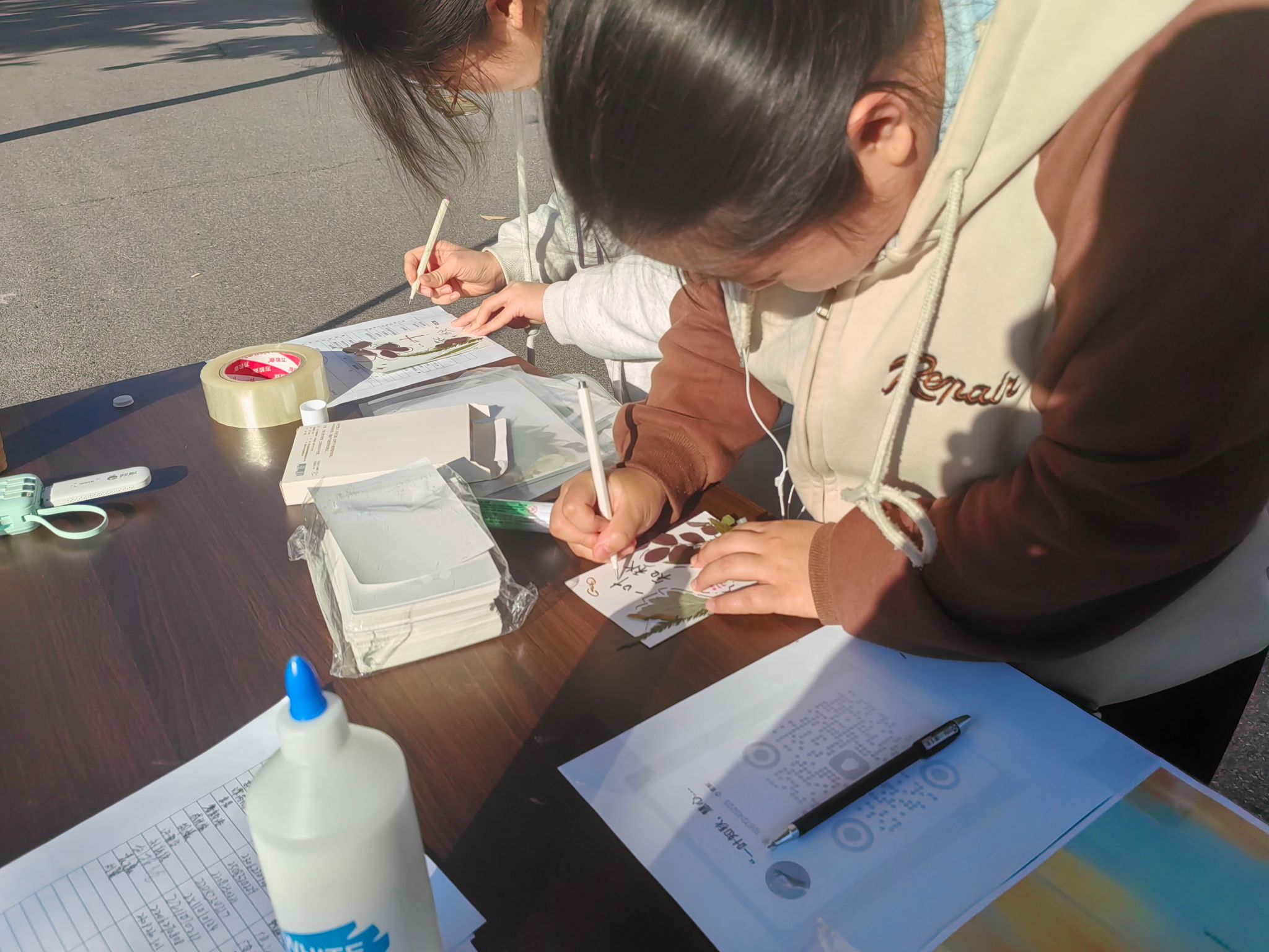 活动现场,明信片卡纸、缤纷水彩、各类粘贴工具与形态各异的秋叶整齐摆放,为同学们的创意创作提供充分支持。围绕“秋之印象”主题,大家大家自由挥洒灵感:或用细腻笔触晕染秋叶脉络,让金黄与绯红在叶片上层层叠叠;或用灵巧双手拼贴落叶,将片片秋叶化作秋日里的飞鸟、小径与暖阳,勾勒出独属于自己的秋日童话。创作过程中,同学们相互交流灵感、彼此倾听、分享心得、互相启发,在协作中拉近距离,在共鸣中悄然打破心墙,让温暖在彼此间传递。