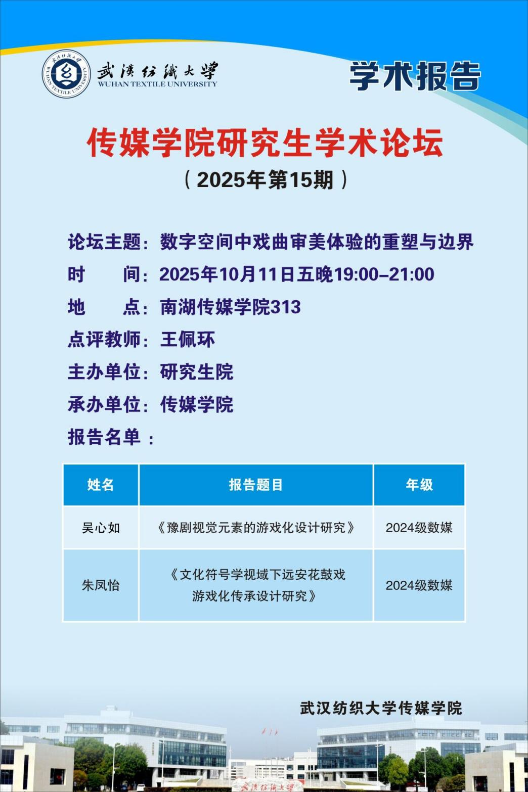 2025年10月11日19时,雷火竞技官网在西配楼S313室举办第15期研究生学术论坛。本次论坛以数字空间中戏曲审美体验的重塑与边界为主题,2024级设计专业研究生吴心如、朱凤怡依次进行汇报分享,论坛由王佩环老师点评分析。