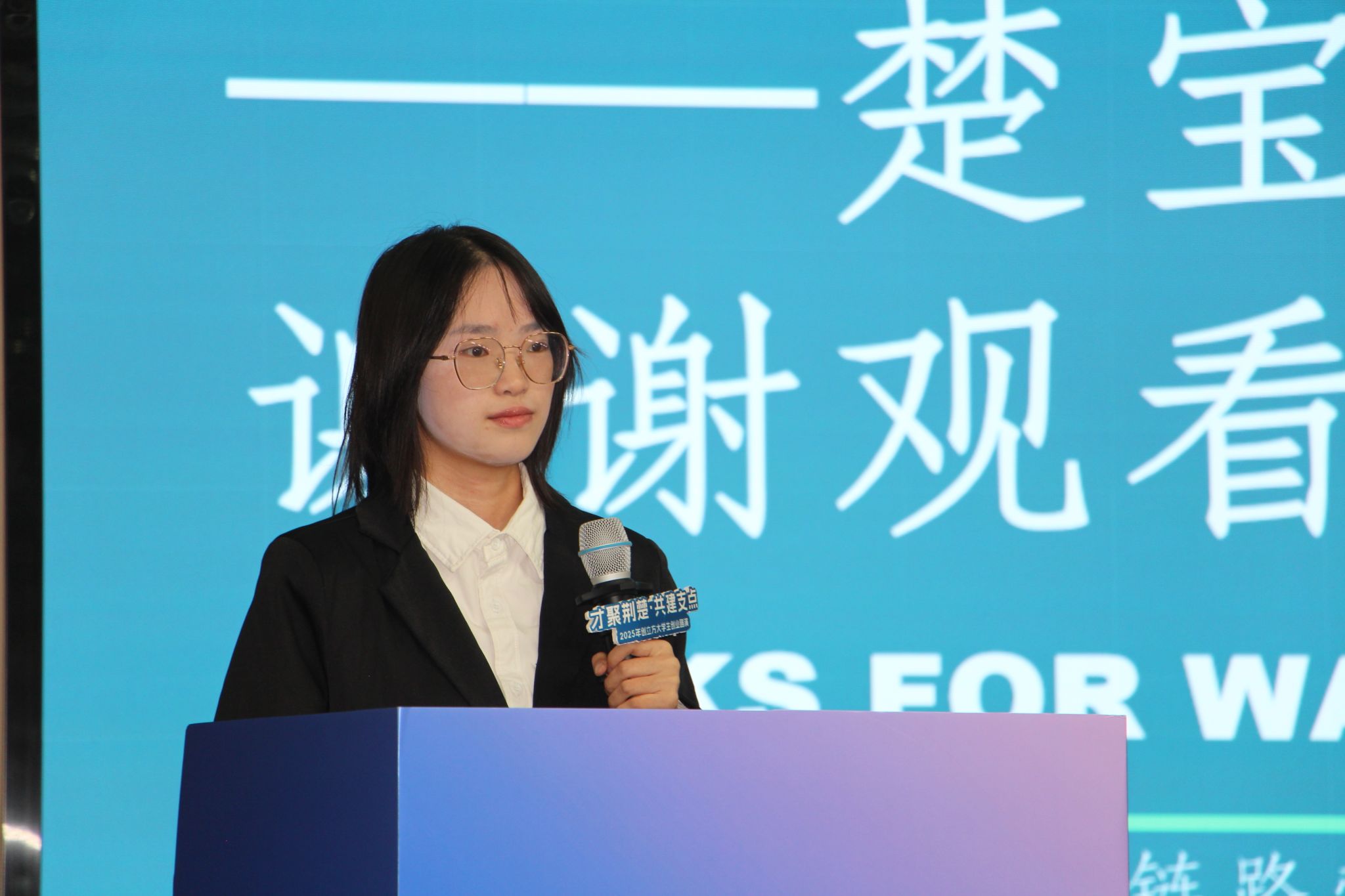 第五个项目由新闻与传播专业研究生舒晓庆展示,聚焦鄂州雕花剪纸的发展现状与转型需求,团队以专属数字产品研发构建和多元商业模式落地为核心方向。通过3D建模、虚拟展示、线上互动等数字技术,推动非遗文化与现代生活场景深度融合,让非遗从“小众传承”走向“大众共享”。