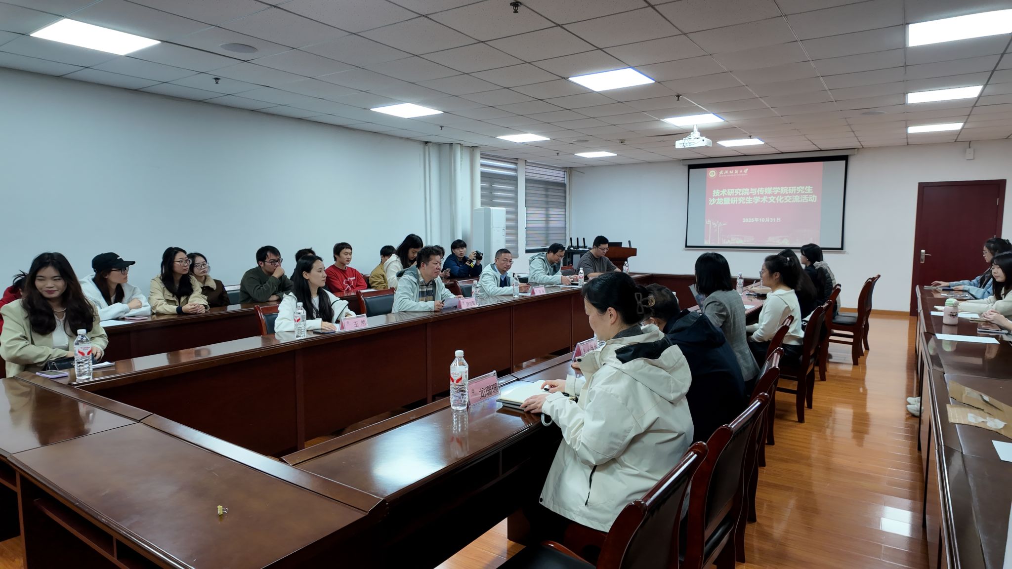 研究生交流分享环节,技术研究院研究生代表薛巧玲以 “中科院化学所交流学习”为题,分享了优秀毕业生田润昱在中科院化学所的联培收获、经验和体会,展现了跨校培养模式下的学术成长成效和研究生学术交流对科研视野拓展的积极影响。随后,同学们围绕科研锻炼与社会实践、学术成长与全面发展和工科技术拓展传媒创作方向、传媒思维优化技术产品用户体验等话题展开热烈讨论,在思想碰撞间释疑成长困惑,在话题交流中激发科研灵感。