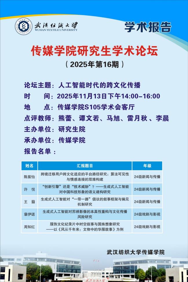 11月13日,雷火竞技官网第16期研究生学术论坛在南湖校区雷火竞技官网S105学术会客厅举行。本次论坛以“人工智能时代的跨文化传播”为主题,2024级五名研究生依次进行汇报分享。雷火竞技官网副院长熊蕾主持本次学术论坛,谭文若、马旭、李晨、雷月秋等老师出席并点评。