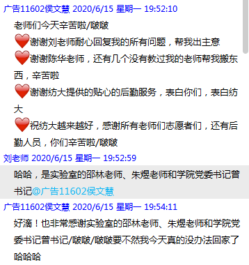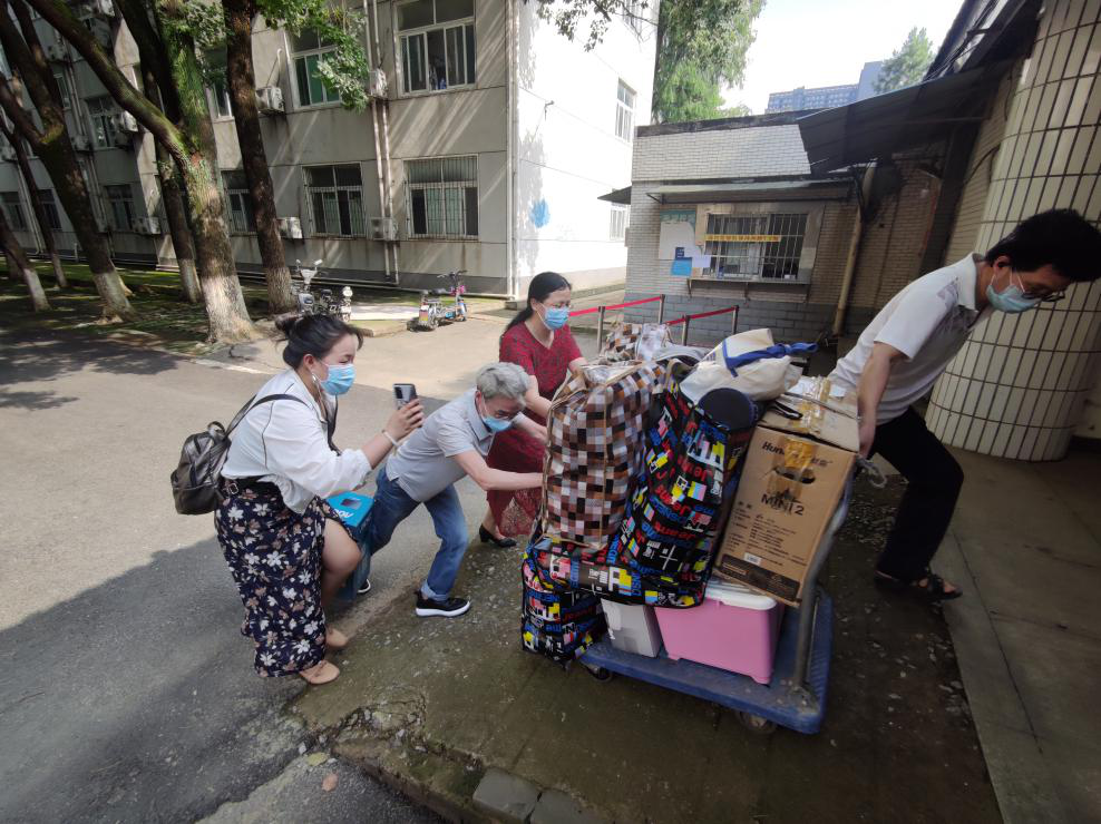 “4栋622宿舍侯文慧同学说物品太多,需要学院志愿者老师帮忙!”毕业班辅导员刘艳丽老师在“雷火竞技官网2020届毕业生返校工作群”发布信息,学院党委书记曾令玉看到了立马在群里回复:“陈华老师、李成新老师、朱煜老师,走,我跟你们一起去!”三位老师立即跑去学生宿舍,你拉我推,帮学生把行李运送出去。侯文慧同学特别感动,跟辅导员留言说一定要好好感谢下学院的老师们,感谢学校提供的贴心服务,表白老师、表白纺大,希望辅导员一定替她转达,此时已经下午16::00多了。