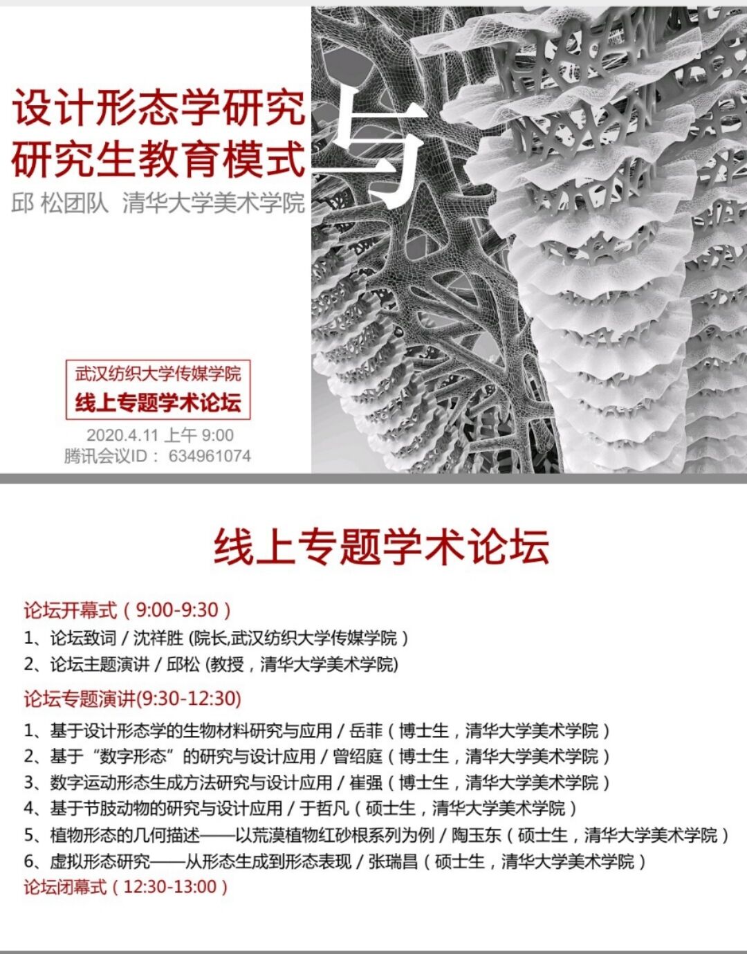 十一日上午,由雷火竞技官网举办的“设计形态学研究暨本、研究生教育模式”论坛在腾讯会议线上平台召开。来自清华大学美术学院的邱松教授团队,牛津大学、南安普顿大学、伦敦艺术学院、清华大学、中央美院、四川美院、西安美院、鲁迅美院、同济大学、北京服装学院、中国传媒大学、上海交通大学、江南大学等近八十所国内外高等院校的三百余名专家及雷火竞技官网相关专业师生参加了此次论坛。