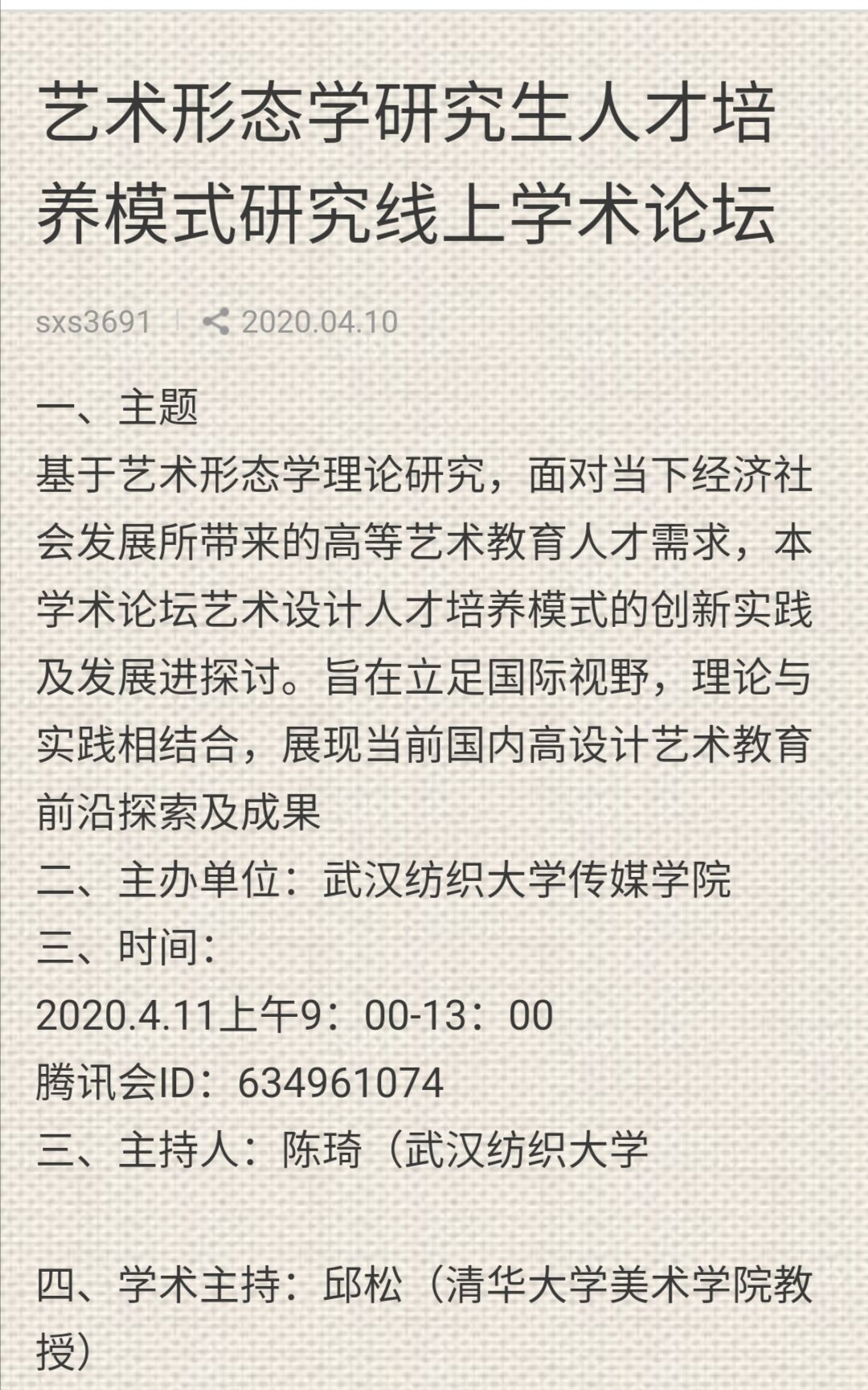 艺术形态学研究暨本、研究生培养模式学术论坛”从上午九点开幕到下午二点钟结朿,近五个小时时间,三百余位教师和学生一直还是兴致盎然。网络一再提醒人数己到达腾讯会议人数上线,很多人因没能进入会场而遗憾。参加论坛的师生感触颇深,在留言中纷纷表示受益匪浅。好像是打开了一扇窗口,探索了艺术设计人才培养的路径。大家从中开阔了设计学发展的思路,学习到了高素质人才培养的前沿方法。