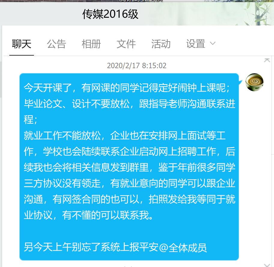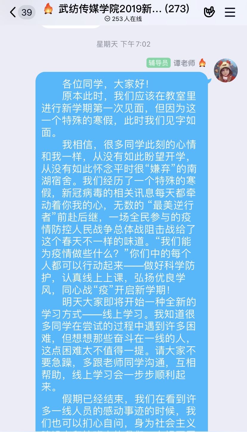 2月16日晚,雷火竞技官网各年级辅导员与学生在QQ群进行了第一次线上班会。