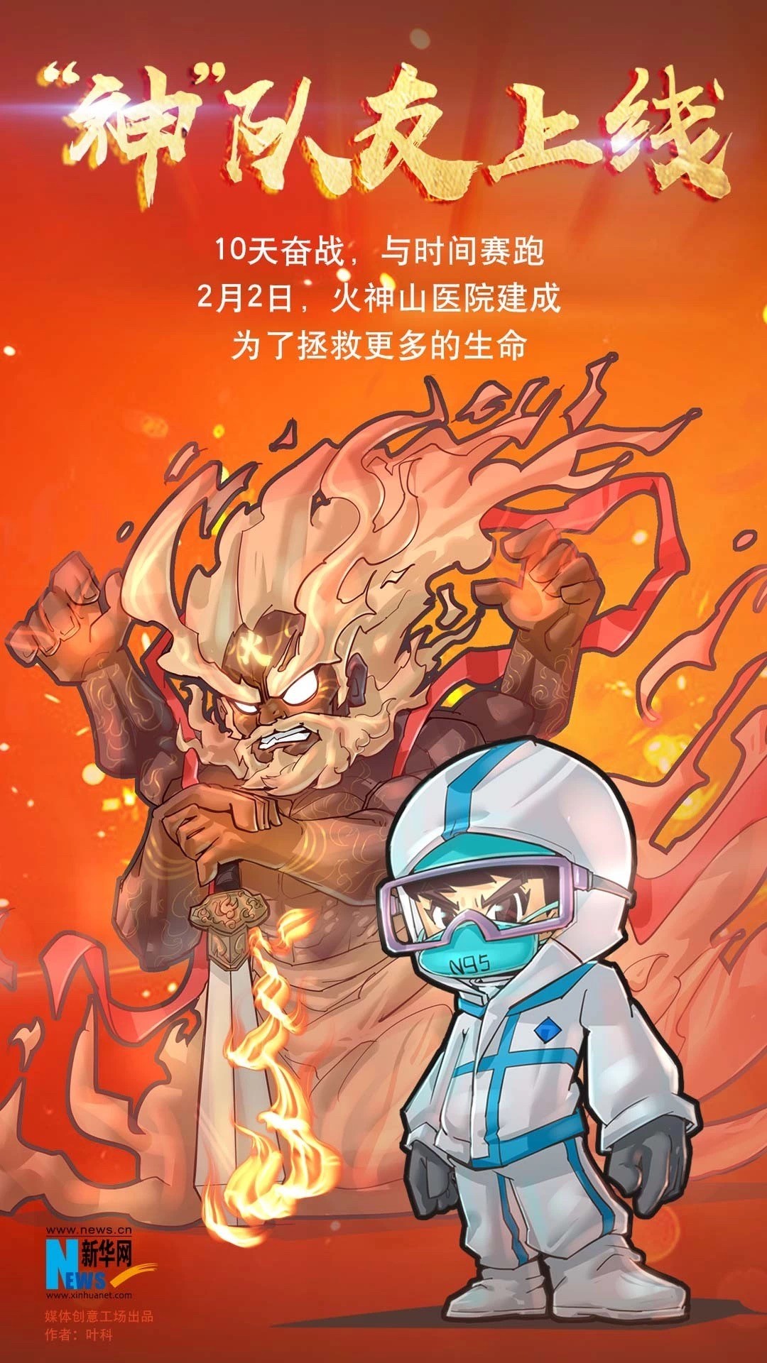 叶科老师的“神队友上线”作品采用了较为流行的动漫元素,将火神山医院拟人化,结合神话人物用澎湃的火焰和坚定的医护工作者,表现出奋斗在一线的人们为了拯救更多生命,经过十天奋战、与时间赛跑,终于在2月2日建成火神山医院。这幅插画及其内涵体现出的中国速度、中国精神让人为之振奋。建设仅10天时间,总建筑面积3.39万平方米、1000张床位。期间,2000多名建设者从四面八方“逆行”参与建设,“国有战,召必回,战必胜!”的信念让他们义无反顾。